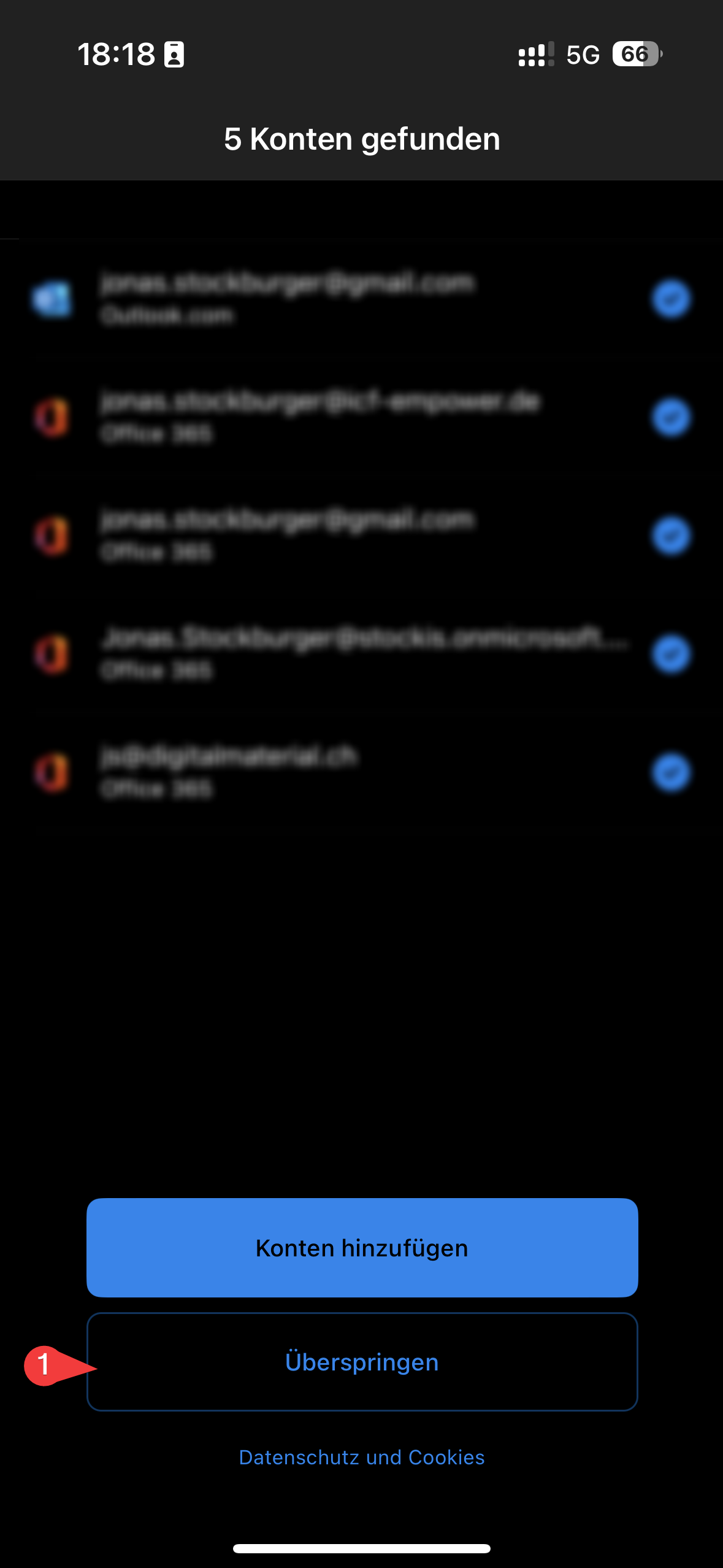 - Beim ersten Start werden evtl. schon vorhandene Accounts angezeigt. Diese können ignoriert werden mit dem Button „Überspringen“.