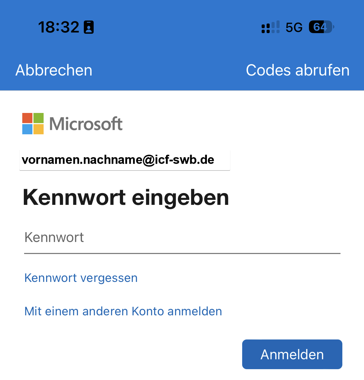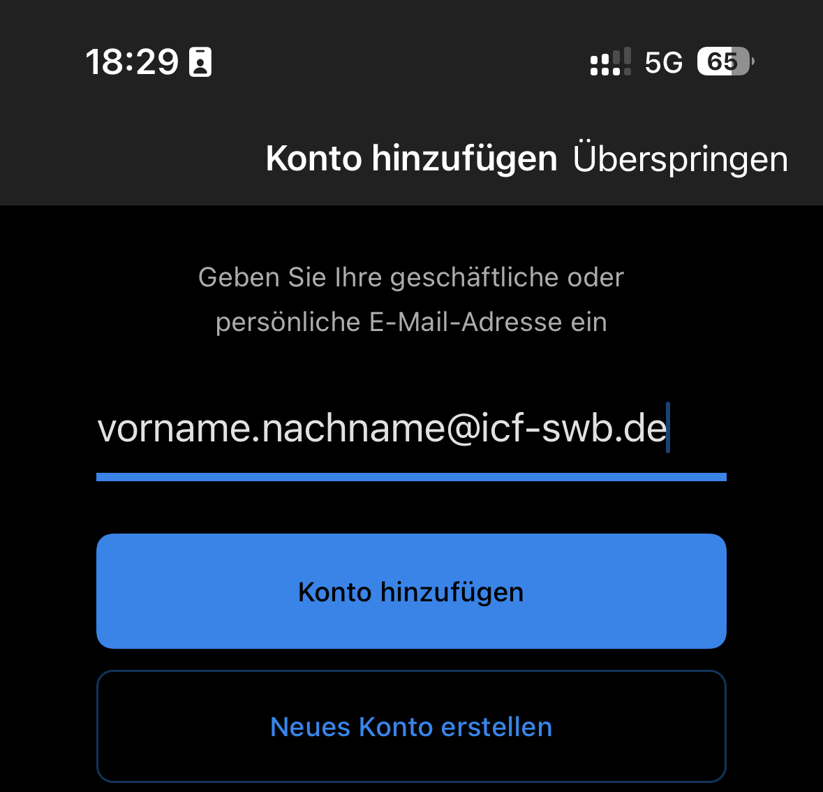 - Gebe nun deine ICF E-Mail (vornamen.nachname@icf-swb.de) ein und folge dem Authentifizierungsprozess.