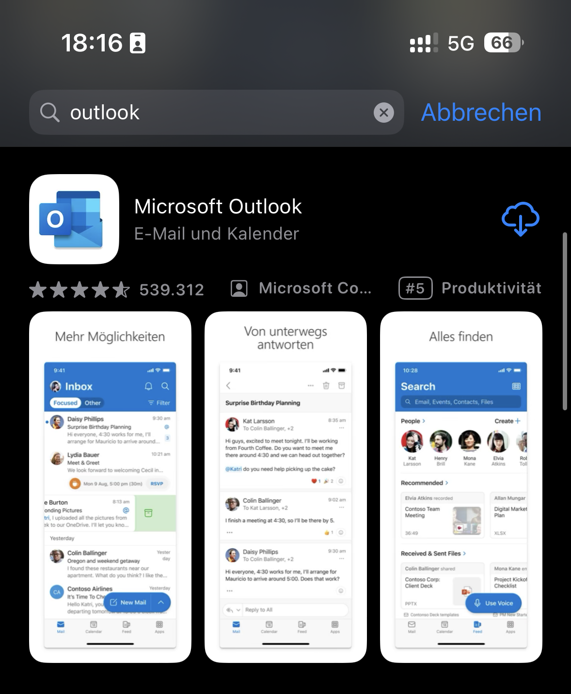 - Downloade die App „Outlook“ im App- oder PlayStore und öffne Sie anschliessend.
