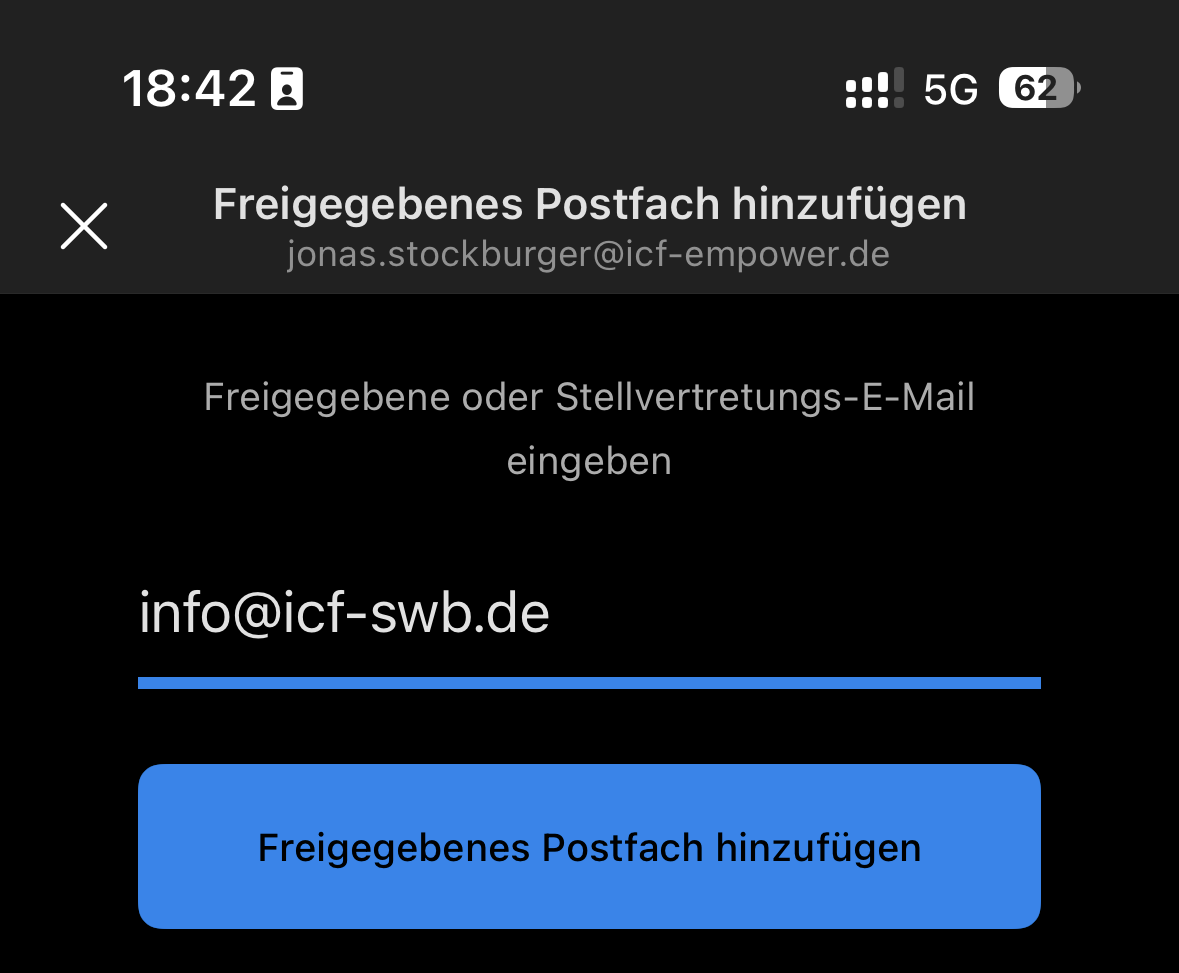 - Gebe nun die E-Mail Adresse (Im Beispiel ist es info@icf-swb.de) des Postfaches welches du öffnen willst ein und füge es über den Button „Freigegebenes Postfach hinzufügen“ hinzu. Wichtig zu beachten, du kannst nur Postfächer öffnen auf die auch Zugriff erhalten hast. Falls du Zugriff auf ein geteiltes Postfach benötigst beantrage dieses bei deinem Leiter.