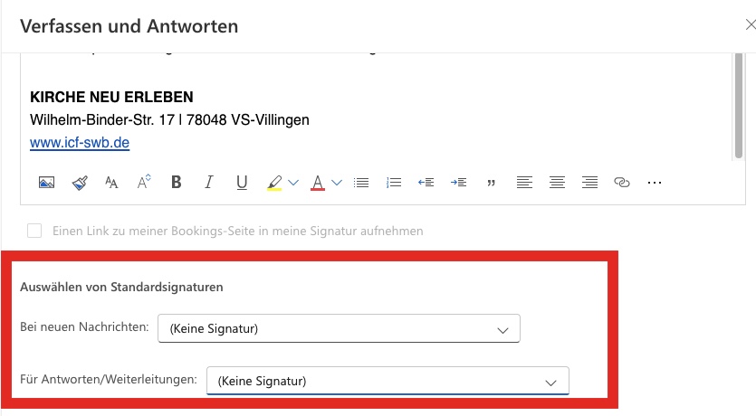 - In den Einstellungen nach unten scrollen, zu dem Reiter E-Mail dort den Punkt Signatur öffnen und die Signatur bei deiner ICF SWB Adresse hinterlegen (hier geht leider nur eine Signatur und gibt keine Funktion für unterschiedliche Positionen eine zu setzen. 🙁 )
