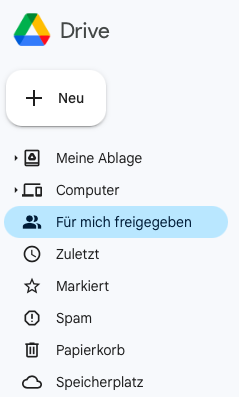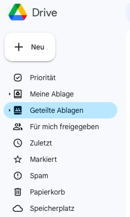 Geht bitte dazu in die Navigation auf der linken Seite Eurer Startseite im Google Drive auf „Geteilte Ablage„: