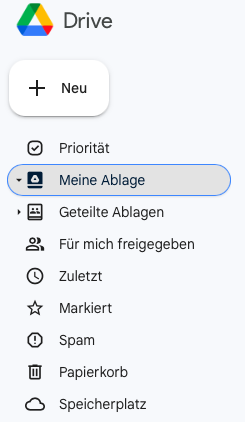 Wie finde ich also jetzt die unterschiedlichen Ebenen der Datenstrukturen und ihre unterschiedlichen Zugriffsberechtigungen? Wenn Ihr Eure Startseite im Google Drive geöffnet habt, seht Ihr links an der Seite die Navigation in den unterschiedlichen Bereichen. Hier findet Ihr den Punkt „Meine Ablage„. Hier befinden sich all Eure Dateien, die Ihr im Google Drive abgelegt habt. Unterm Punkt „Geteilte Ablage“ findest Du all die Ordner und Dateien, wo Ihr Zugriffsrechte habt bzw. erteilt. Auf dem folgendem Bild seht Ihr den Punkt „Meine Ablage“ markiert: